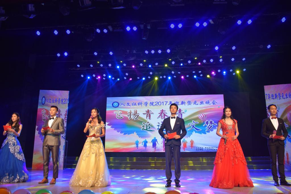 2017年12月14日晚,攀枝花学院人文社科学院于会堂举办以“飞扬青春情,追逐人文梦”为主题的迎新暨元旦晚会。伴随着师生们热烈的掌声,人文学院学生表演的乐队弹唱《光辉岁月》拉开了本场晚会的序幕。